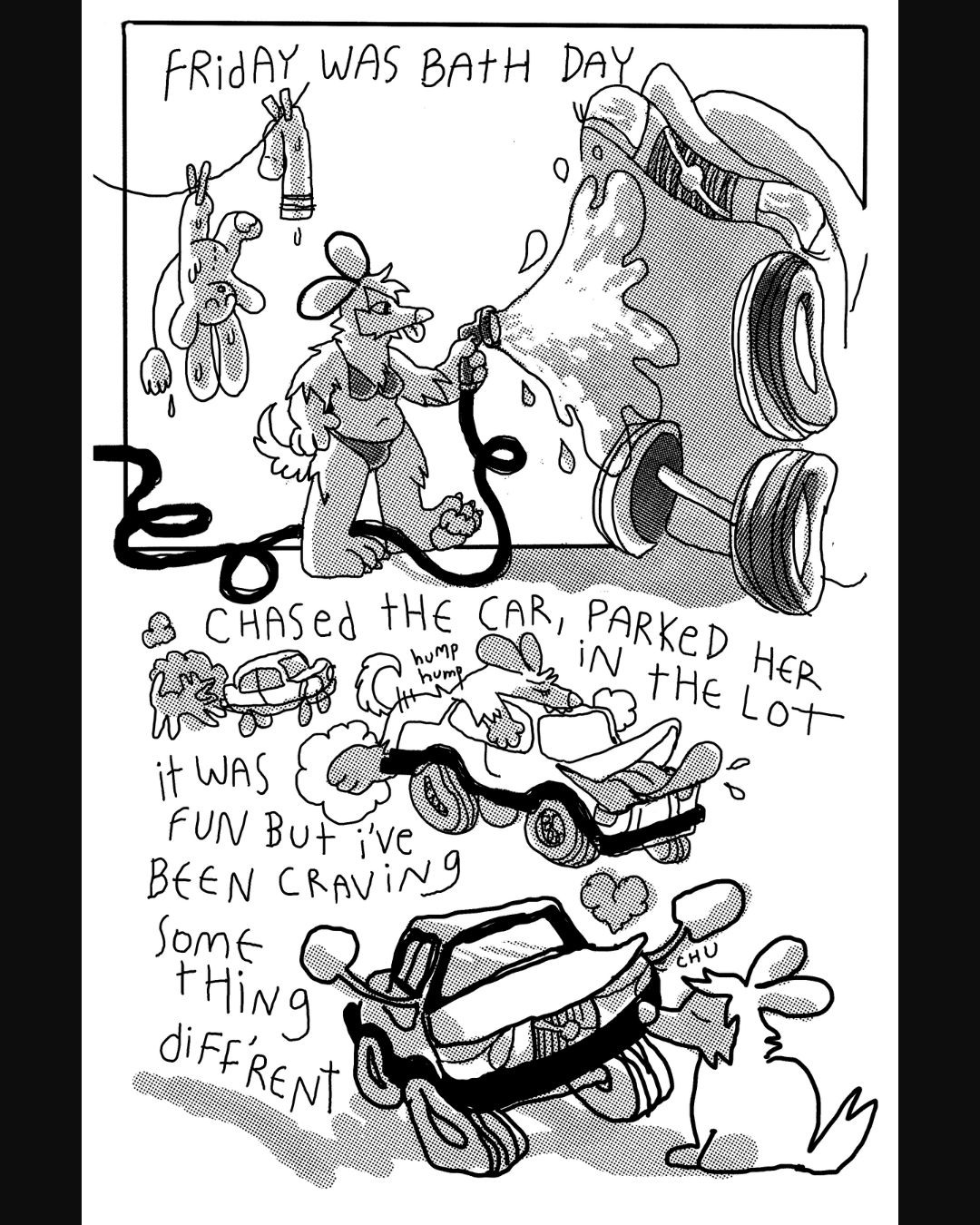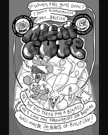 A funny-animal comic that's part roommate sex comedy, part toycore body horror 🧸 32 page b/w comic, available as a downloadable PDF.